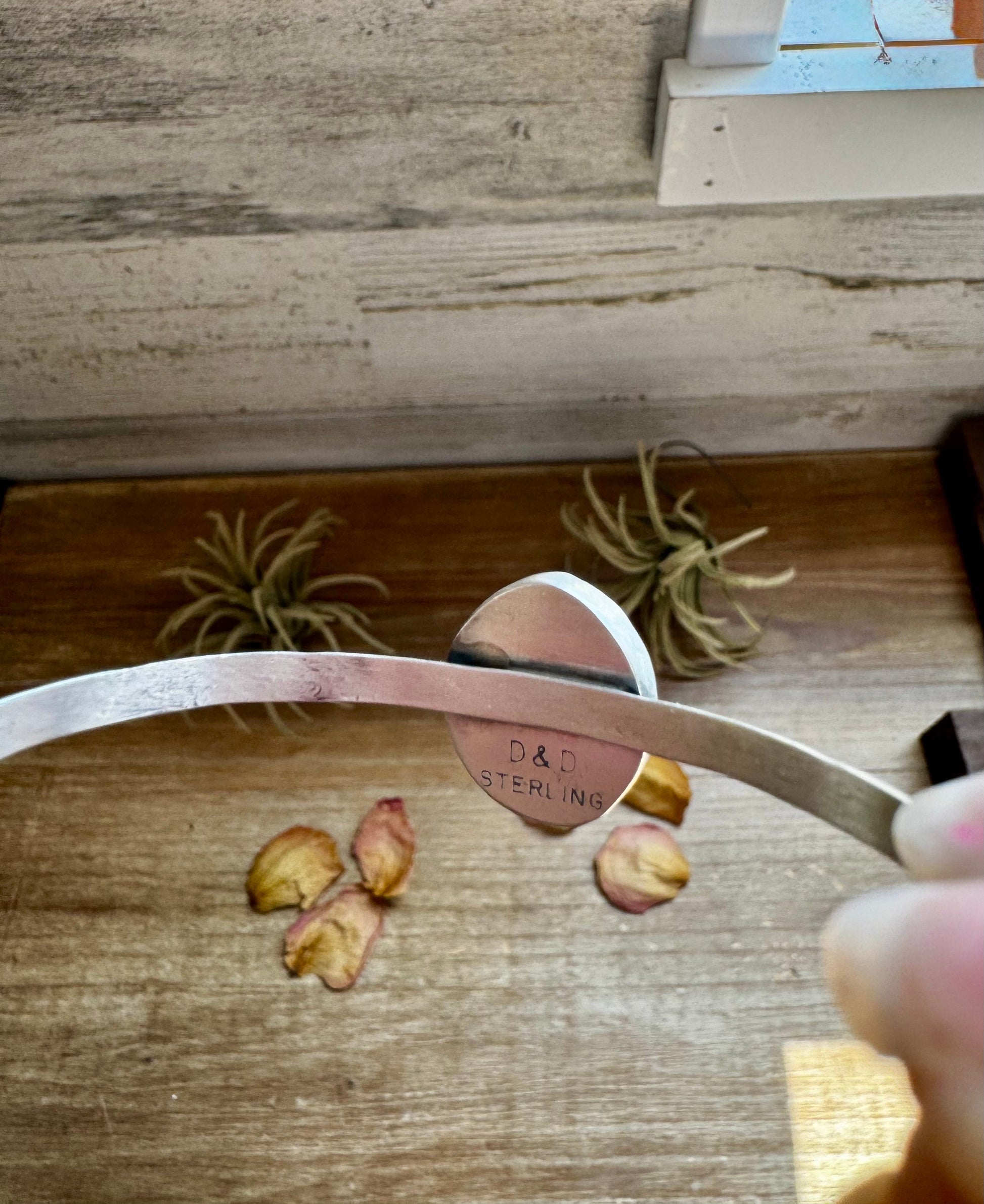 This bold cuff features beautiful Blue Moon turquoise set in sterling silver. Stamped D&D, this piece blends clean silverwork with vibrant turquoise, showcasing matrix and color variation that make each stone stand out. A true collector’s piece.