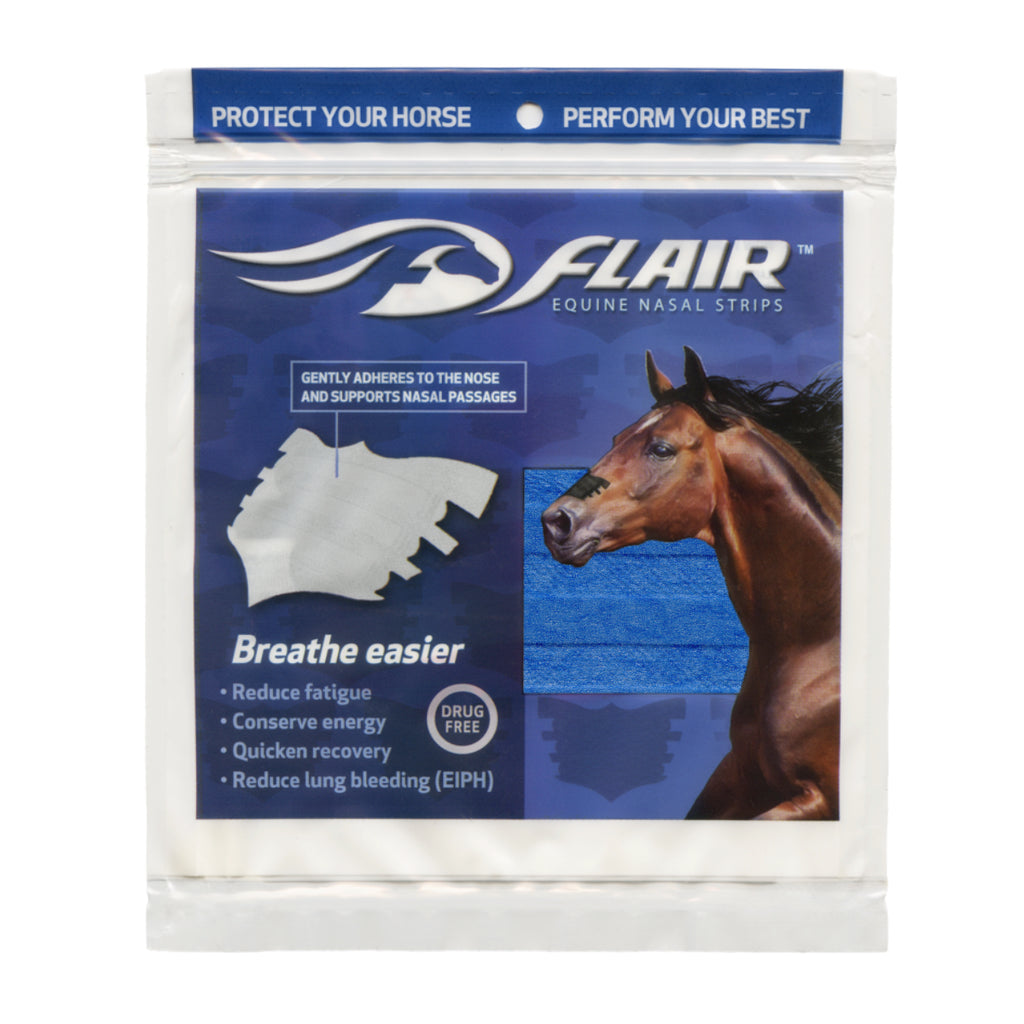 Developed by veterinarians, FLAIR Strips are drug-free, self-adhesive nasal strips that promote optimum health of equine athletes, in all disciplines and every level of competition. The Strips gently support the soft tissues over the nasal passages to reduce airway resistance and improve airflow when your horse needs oxygen most.