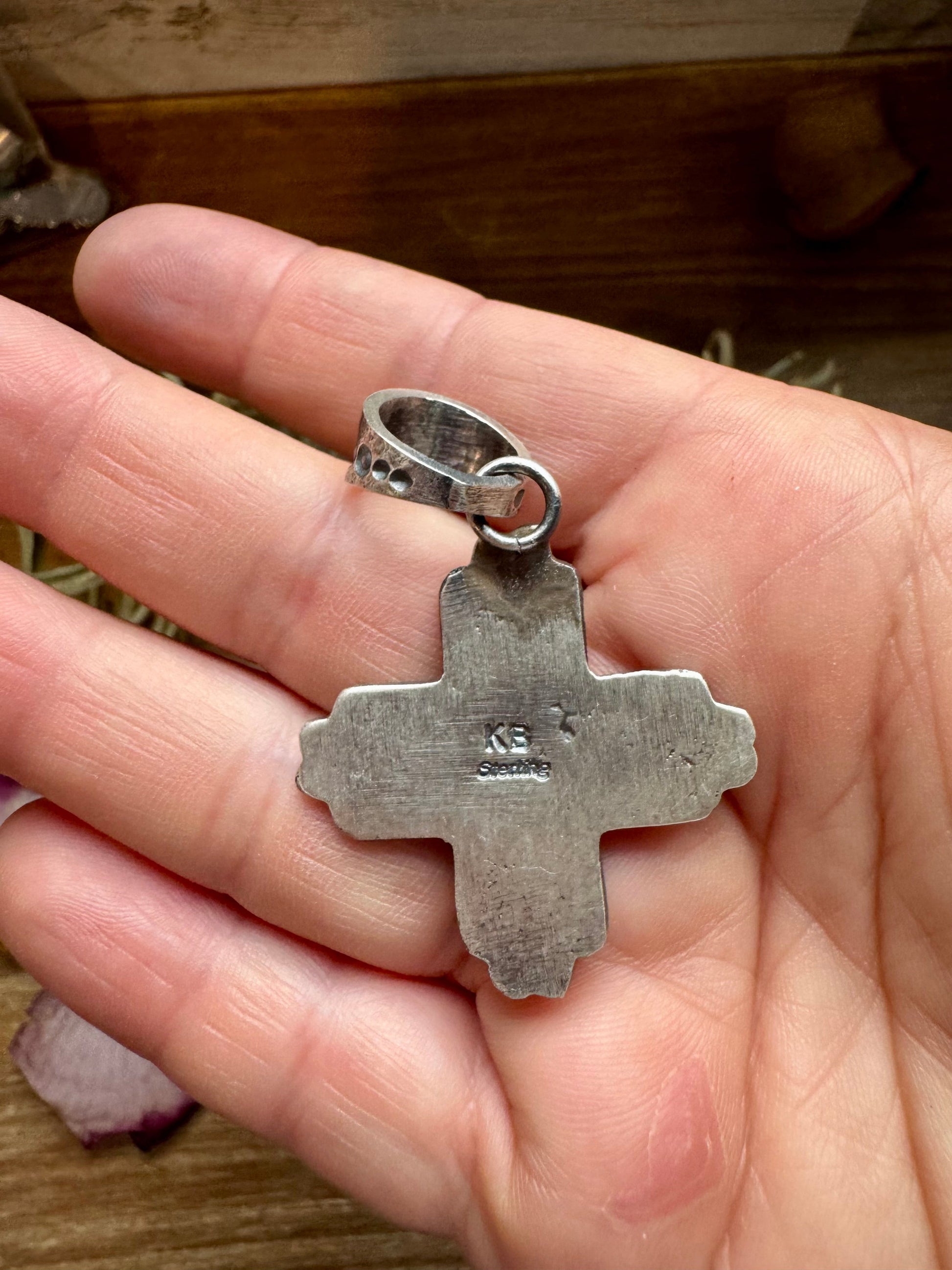 Handmade in the USA by Native silversmith K. Billah, this sterling silver pendant features the sacred Zia sun symbolwith a Golden Hill turquoise centerpiece. Known for its pale blue to lilac shades and delicate matrix, Golden Hill turquoise is one of the most collectible varieties today. Stamped for authenticity, this pendant combines meaningful cultural symbolism with rare turquoise beauty. The bail fits up to 8mm pearls, making it easy to wear with a sterling silver pearl strand, chain, or leather cord.
